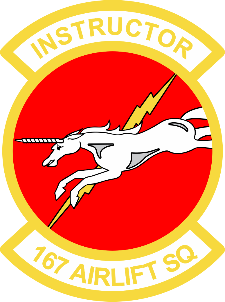 West Virginia ANG 167 AS - Instructor 167 Airlift Sq White, Gray, and Black Unicorn with Yellow Lightning Bolt, Red Background, Yellow Border, and Text 3.47" with velcro