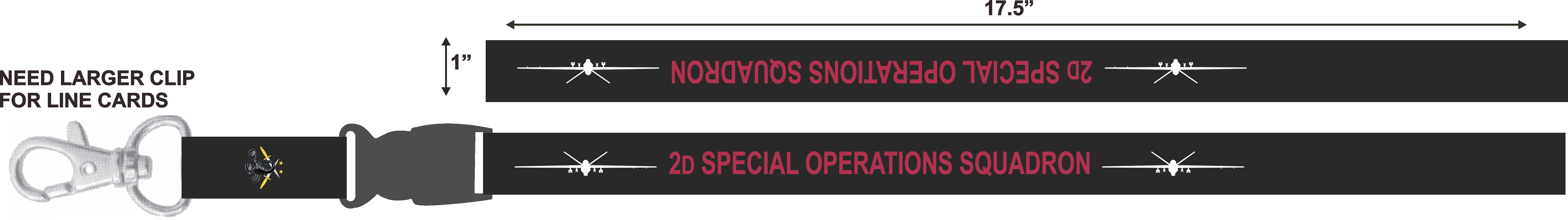 Hurlburt Field 2nd Special Operations Squadron Lanyard Black Background, White MQ-9, Red Text
