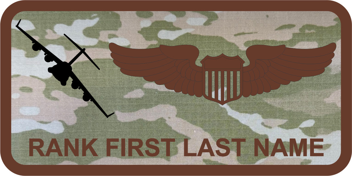 McChord AFB 57 WPS -C-17 OCP Name Tag - 3-Color OCP Fabric Background, Spice Brown Border, Wings & Text, with Black C-17 on the Left.