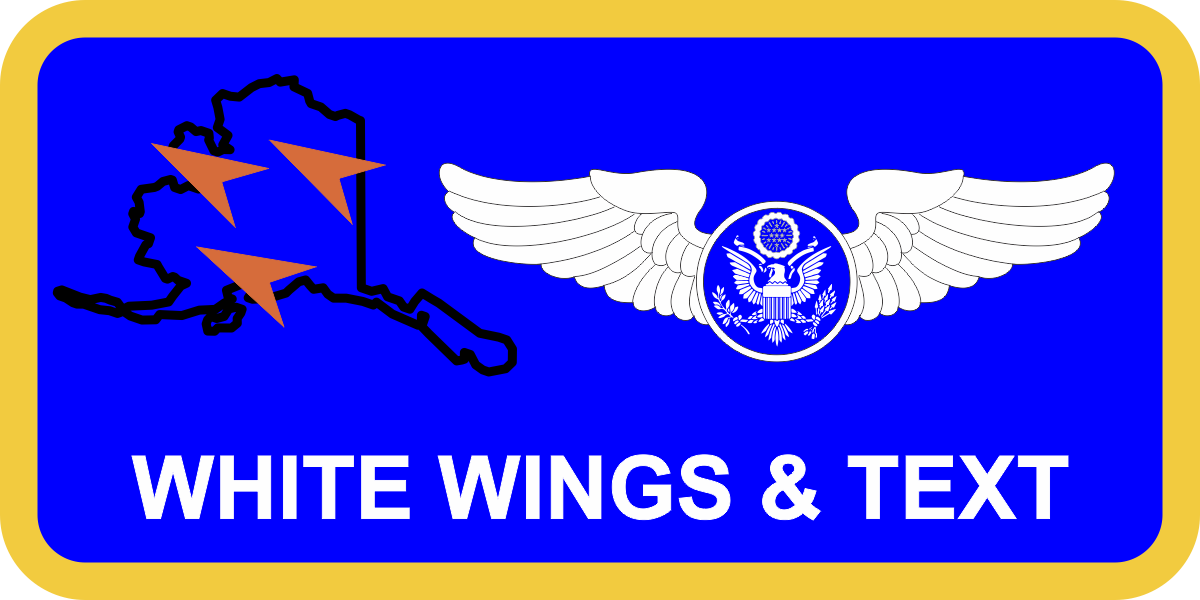 Elmendorf AFB 611 AOC Name Tag- AF Blue Background, AF Yellow Border, White Wings & Text with Orange Deltas Over Black Alaska State Outline