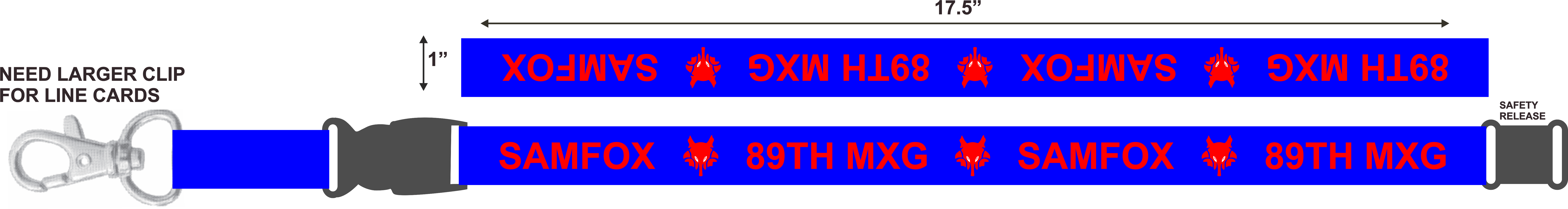 Andrews AFB 89 MXG Blue Background, Red SAMFOX Text & Fox, Larger Clip with Safety Release at the Neck, Lanyard