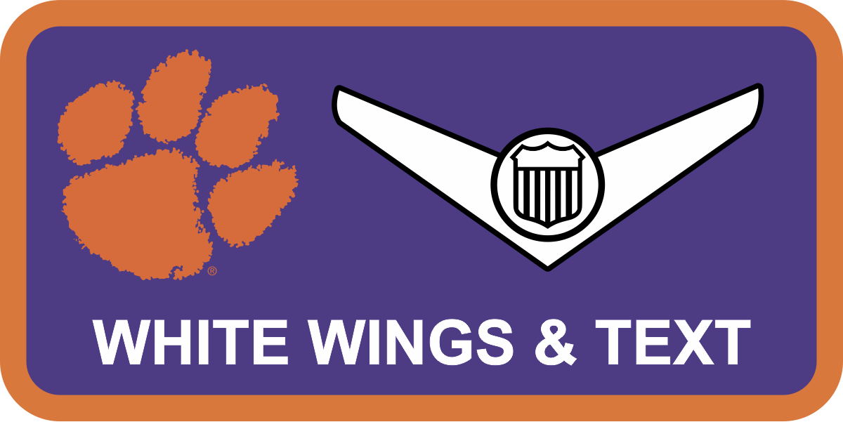 Clemson University - AFROTC Det 770 Purple Background, Orange Border, White Wings & Text, with Orange Paw Logo.