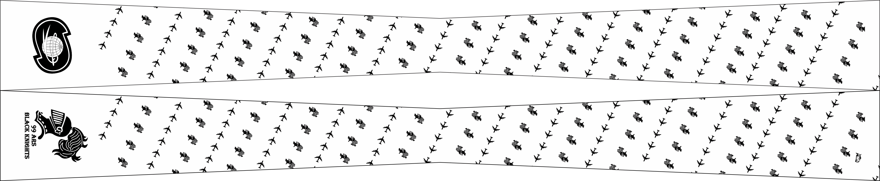 Birmingham ANGB 99 ARS Flight Scarf. White Background, KC-135 Aircraft & Knight Helmet Pattern, 99 ARS Logo on the end of the scarf. Size: 4" x 2" x 2" x 48".