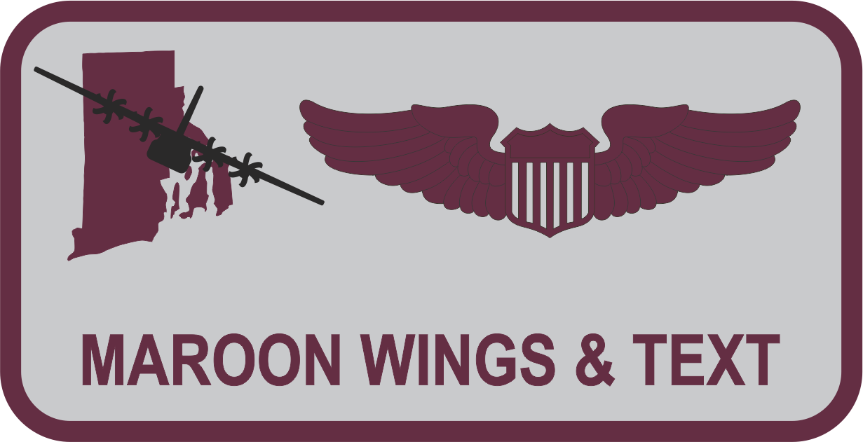 Rhode Island ANG Name Tag- Gray Background, Maroon Border, Maroon Wings and Text, Black C-130, Maroon Rhode Island State Outline Logo