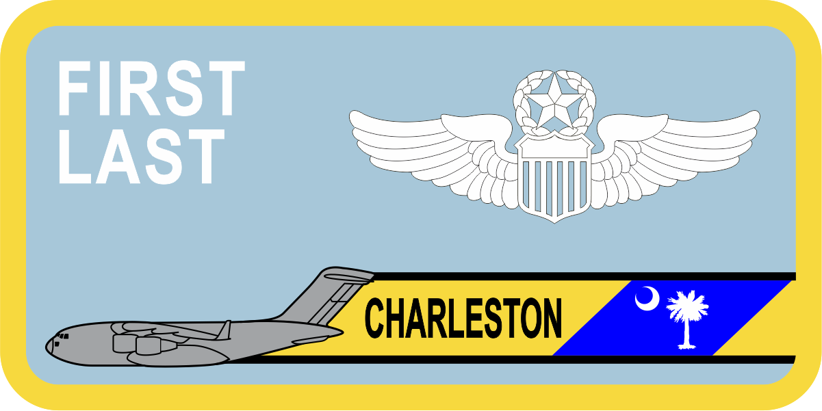 Charleston AFB 437 AW Tail Flash Name Tag - Light Blue Background, AF Yellow Border, White Wings & Text with C-17 Aircraft & Tail Flash