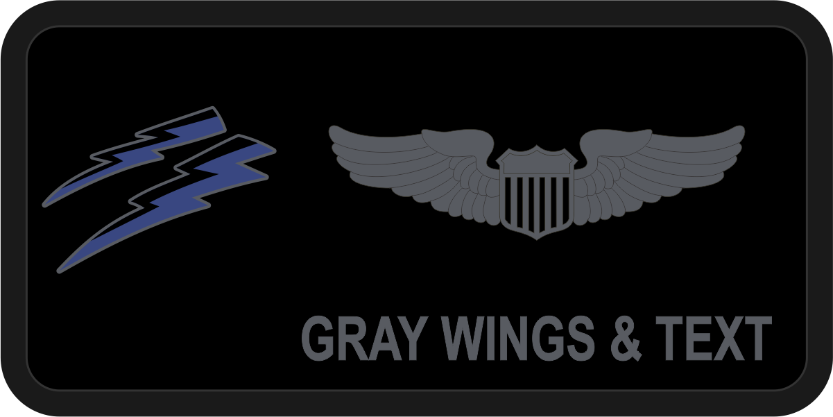 Creech AFB 22 ATKS Nametag Black Background Black Border, Gray Wings & Text with Blue/Black Lightning Bolts