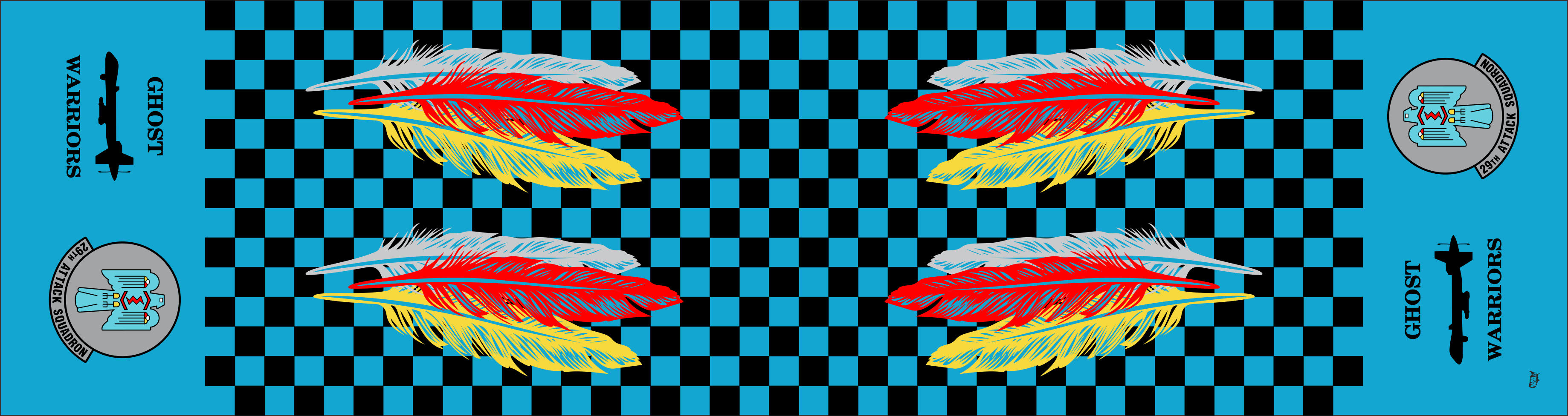 Holloman AFB 29 ATKS Flight Scarf. Sky Blue Background With Black Checkered Pattern and Feathers in the Center, SQ Emblem and MQ-9 "Ghost Warriors" Emblem on the Ends of the Scarf. Size: 6" x 48"