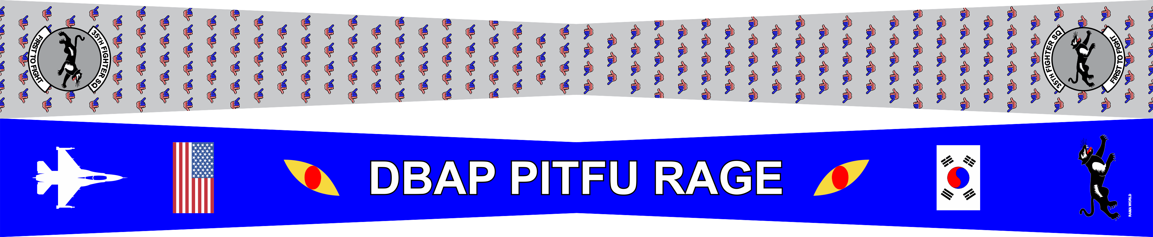 Kunsan South Korea 35 FS Flight Scarf. Front Side: Light Gray background With "push it ups" Logo Through-Out. Back Side: AF Blue Background, With Text In The Center, Bill Eyes On Both Sides Of The Text, US Flag & Korean Flag, F-16 & SQ Emblem On The Ends. Size: 4" x 2" x 4" x 48".