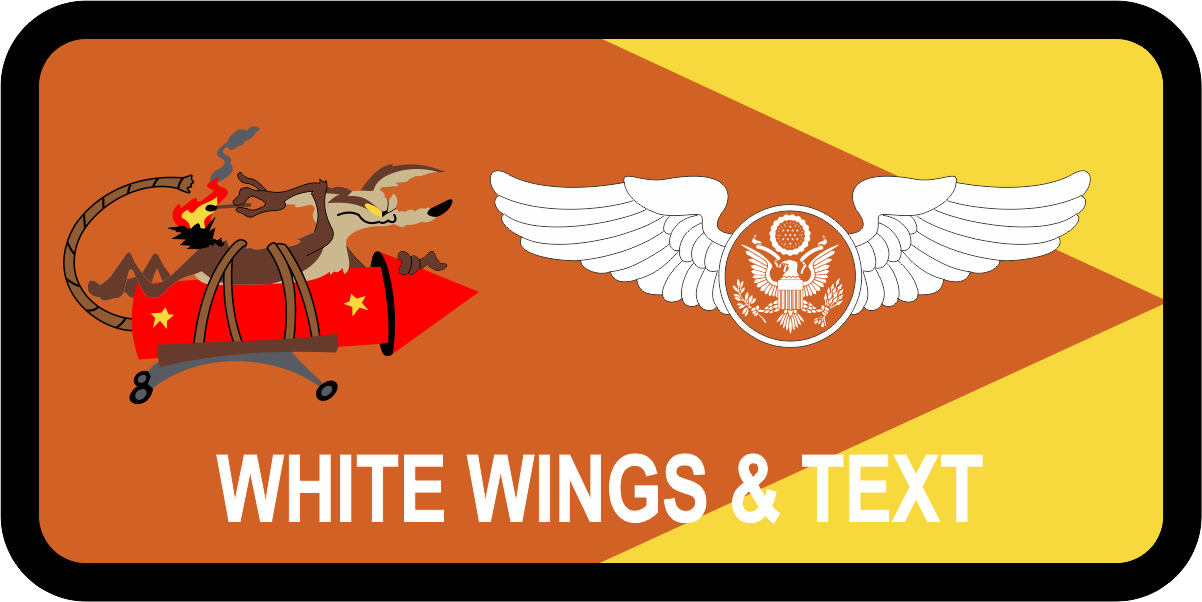 Laughlin AFB 85 FTS Name Tag -  Wile E Coyote, Orange & Yellow Background, Black Border, White Wings & Text, Wile E Coyote Logo