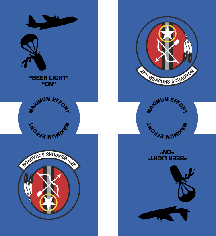 Little Rock AFB 29 WPS Koozie. AF Blue Background With "Beer Light" "On" Logo On One Side, 29 WPS Patch On The Opposite Side & "Maximum Effort" Patch On The Bottom Of The Koozie.