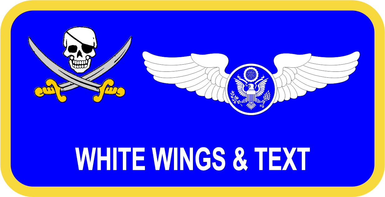 927 AMXS Name Tag - Royal Blue Background, Yellow Border, Pirate with Sword Logo, White Wing & Text