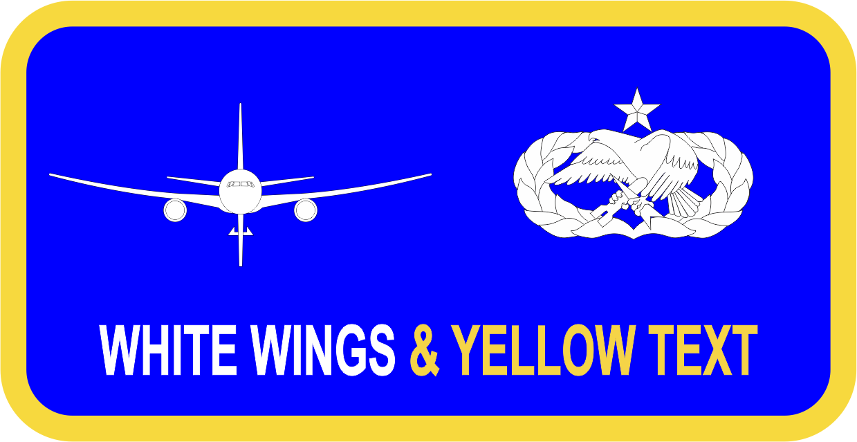 McConnell AFB 22 AMXS  Name Tag - Blue Background, Yellow Border, White KC-46 Boom Down, White Devices, Yellow Text