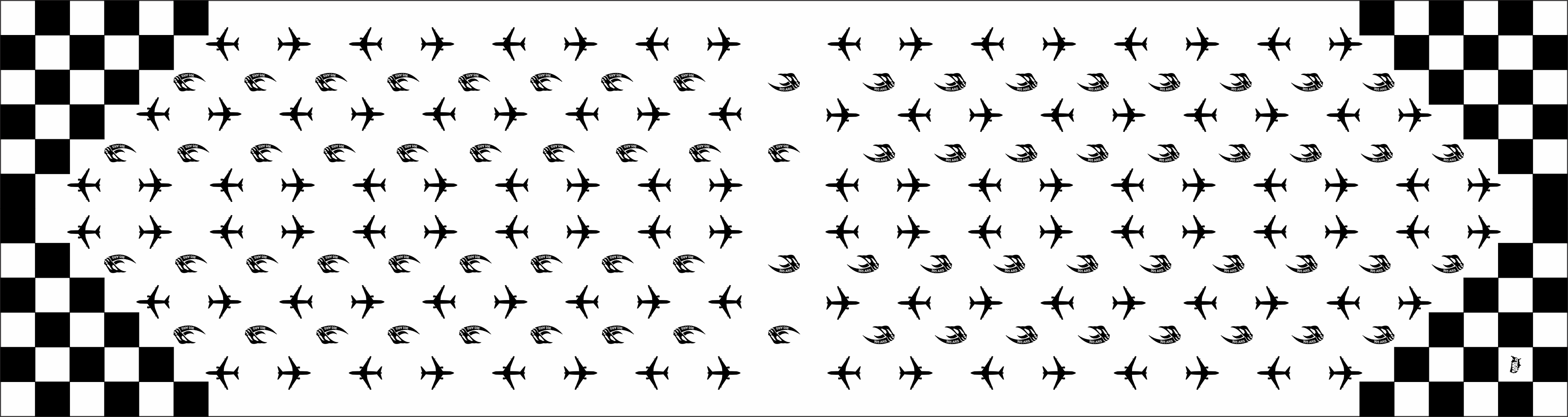 McConnell AFB 905 ARS Flight Scarf. White Background With Black & White Checkered Pattern On The Ends, KC-46 Aircraft & 905 ARS Emblem Throughout The Scarf. Size: 6" x 48".