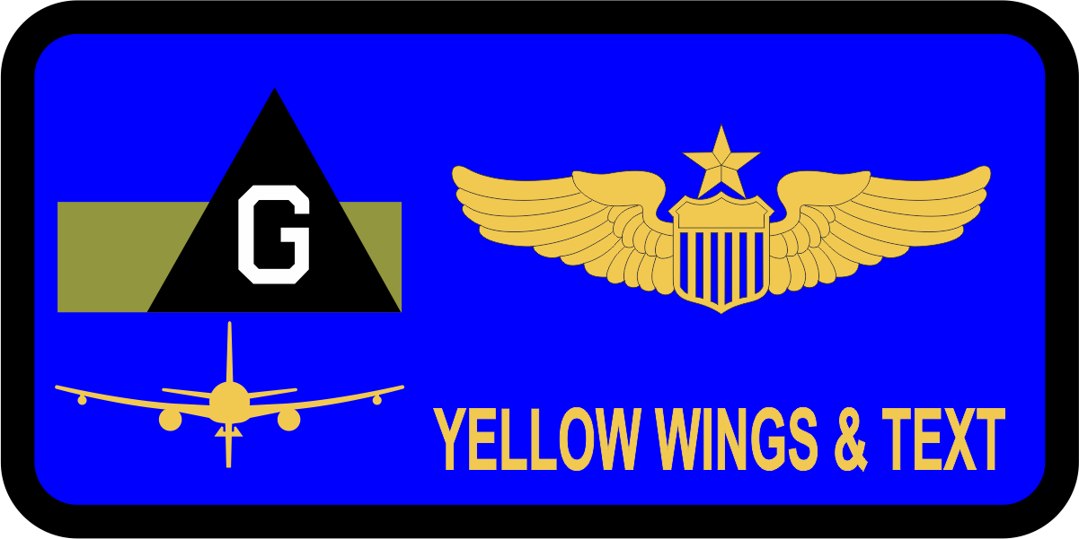McGuire 305 AMW Name Tag - Friday KC-46 Tag - AF Blue Background with Black Border with Yellow Text and Wings, Yellow KC-46 Aircraft, with G Triangle Logo