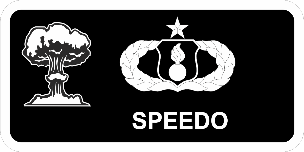 Nellis USAF AMMOS Name Tag - Black Background, White Border, White Wings & Text, White/Black Nuclear Explosion Logo