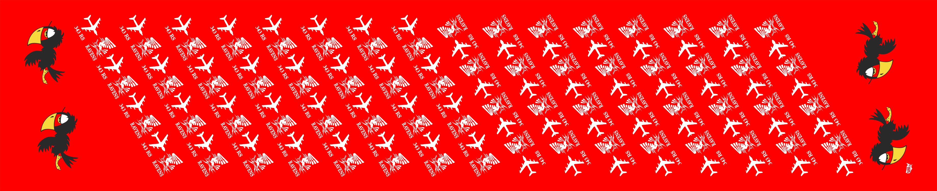 Offut AFB 343 RS Red Flight Scarf with Raven SQ Logo on the ends of the Scarf and the RC-135R Aircraft & Ravens Emblem throughout the Scarf. Size: 5" x 48".