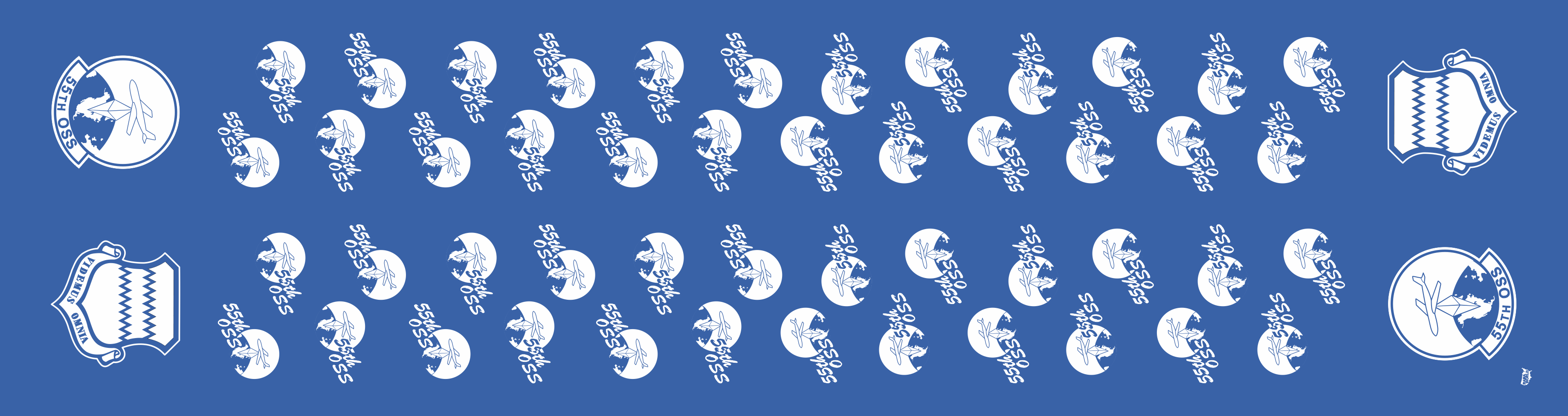 Offutt AFB 55 OSS Flight Scarf. AF Blue Background With Patches On The Ends & The 55 OSS Logo Through Out The Scarf. Size: 6" x 48".