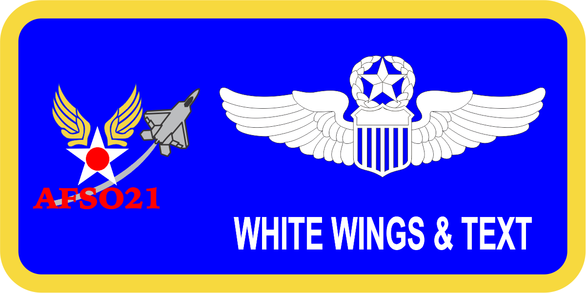 Pentagon AFSO21 Name Tag AF Blue Background with AF Yellow Border with White Text and Wings, AFSO21 Logo