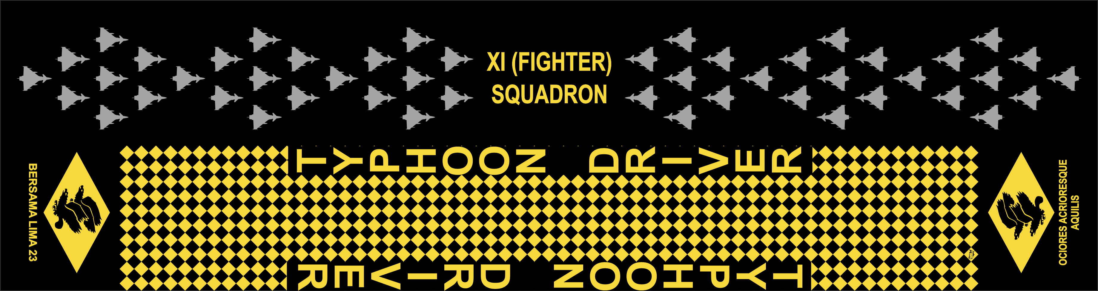RAF Coningsby XI Squadron Flight Scarf. Front Side: Black Background, Typhoon Silhouette Pattern & "XI (Fighter) Squadron" Text In The Center. Back Side: Black Background With Yellow Checkerboard Pattern, SQ Logo On The Ends Of The Scarf & "Typhoon Driver" On The Sides Of The Scarf. Size: 6" x 48".