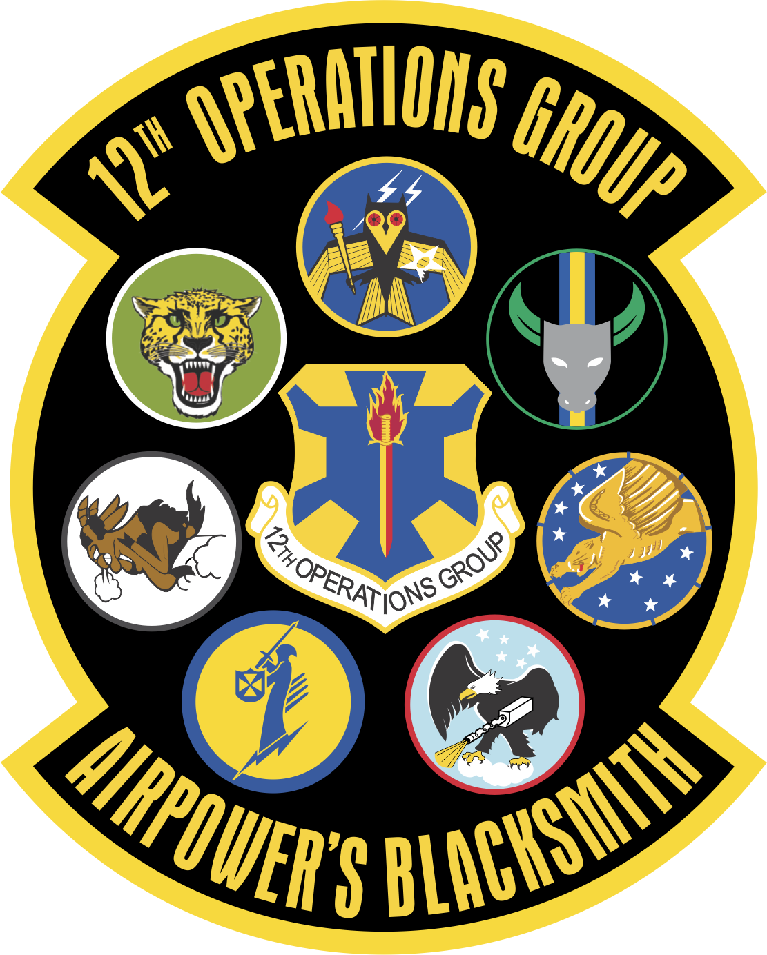 Randolph AFB 12th Operations Group Airpower's Blacksmith 15 Thread Colors - Multi-Logos Pizza Patches 4.5" -- Revised 2023