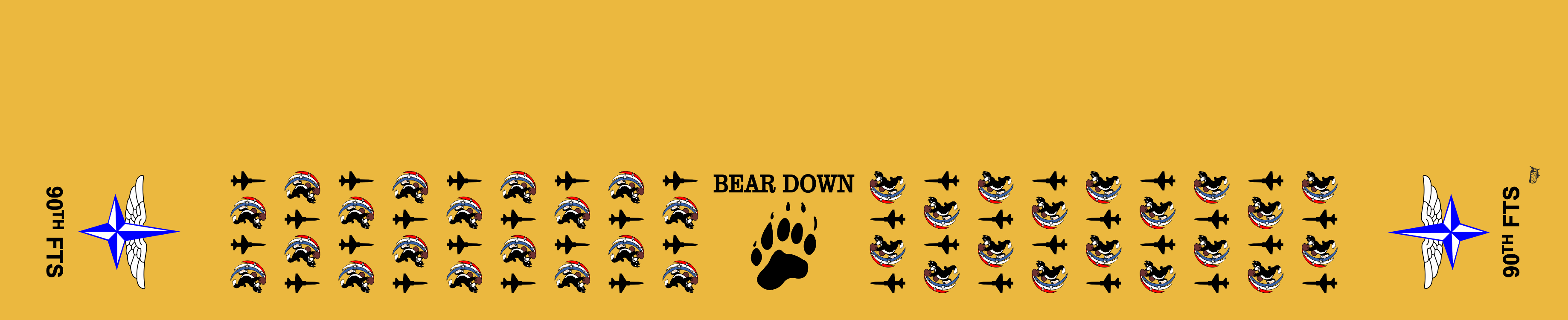 Sheppard AFB 90 FTS Flight Scarf. Yellow Background With SQ Heritage Logo & T-38 Aircrafts & "Bear Down" on One Side of the Scarf. Size: 6" x 48".