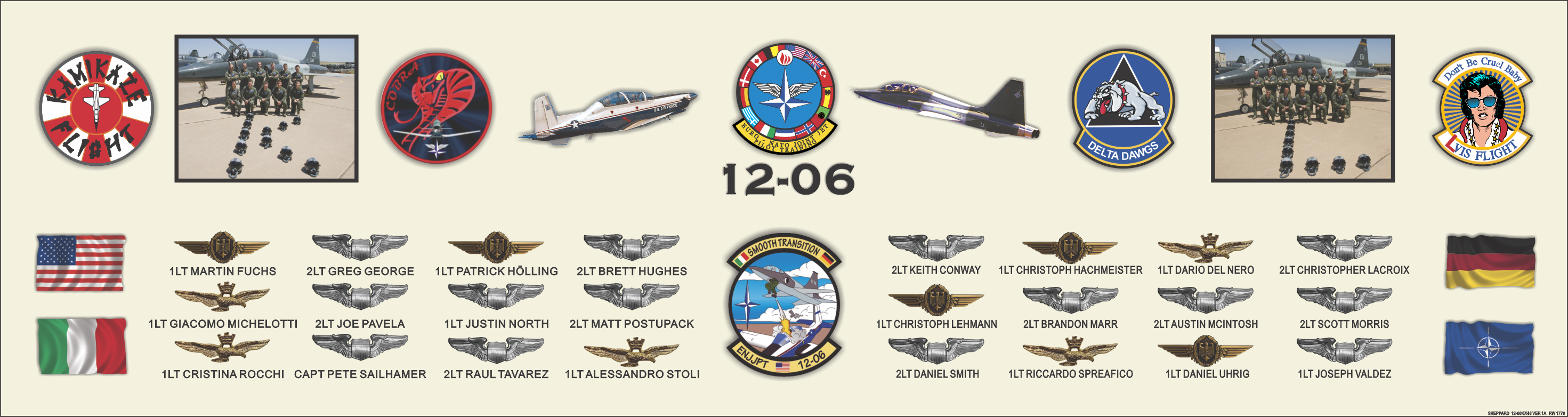 Cream Colored Background, Patches, Aircraft, Pilot Names, Pilot Wings, Pilot Group Photos, Country Flags