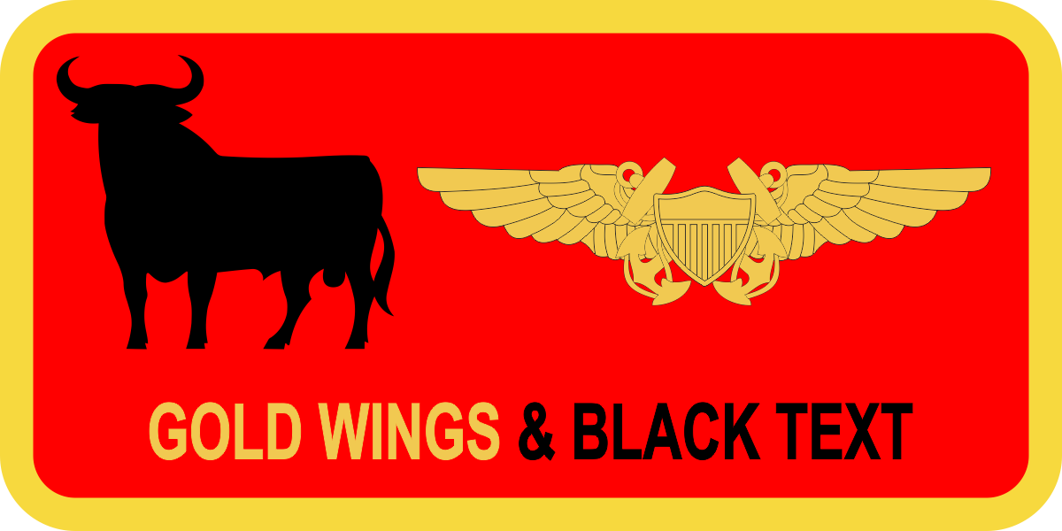 Madrid Spain CAOC - Navy Name Tag - Red Background, Yellow/Gold Border, Black Bull Toro Logo, Gold/Yellow Wings & Black Text