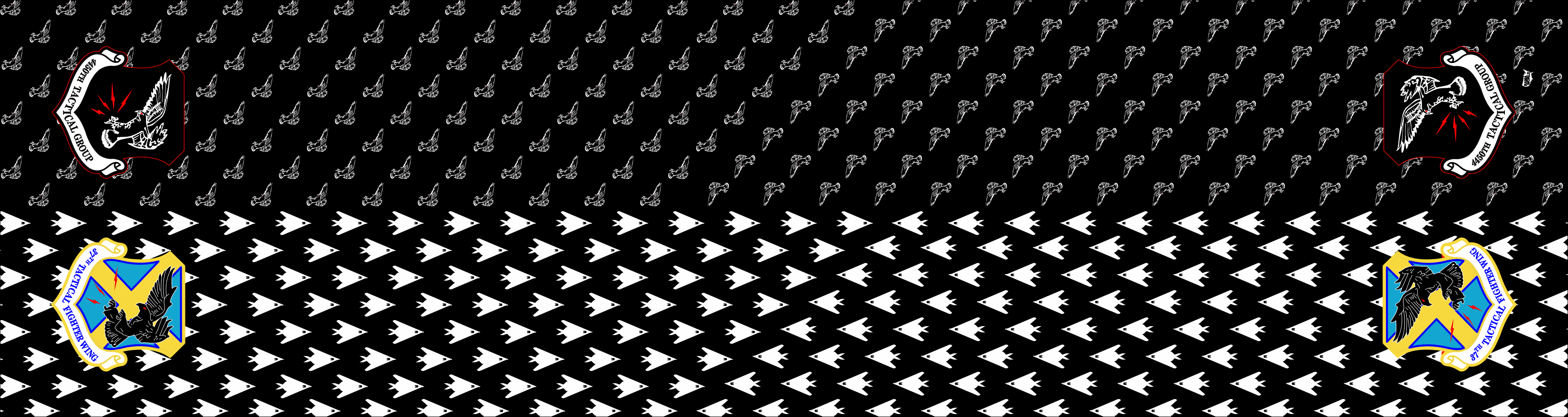 Tonopah Test Range 37 FW Black Flight Scarf. Front Side: 4450th Tactical Group Patch on Each Side & Raven Pattern. Back Side: 37 Tactical Fighter Wing Patch on Each Side & F-117 Pattern. Size: 6" x 48".