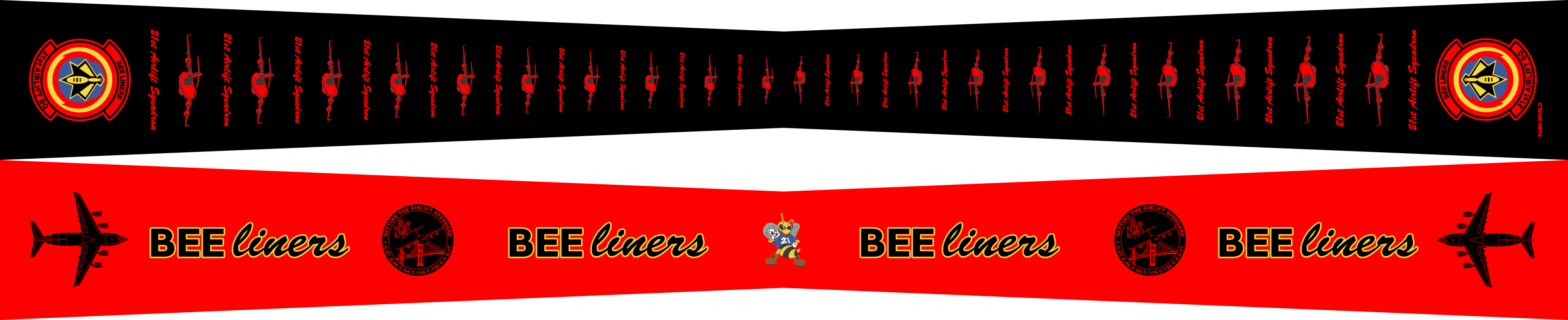 Travis AFB 21 AS Flight Scarf. Front Side: Black Background With SQ Patches on the Ends, C-17 Aircraft and "21st Airlift Squadron" Text Alternating Through Out. Back side: Red Background With C-17 Aircraft on the Ends With "Beeliners" Text and SQ Patch Alternating, and Bee Logo in the Center. Size: 4" x 2" x 48".