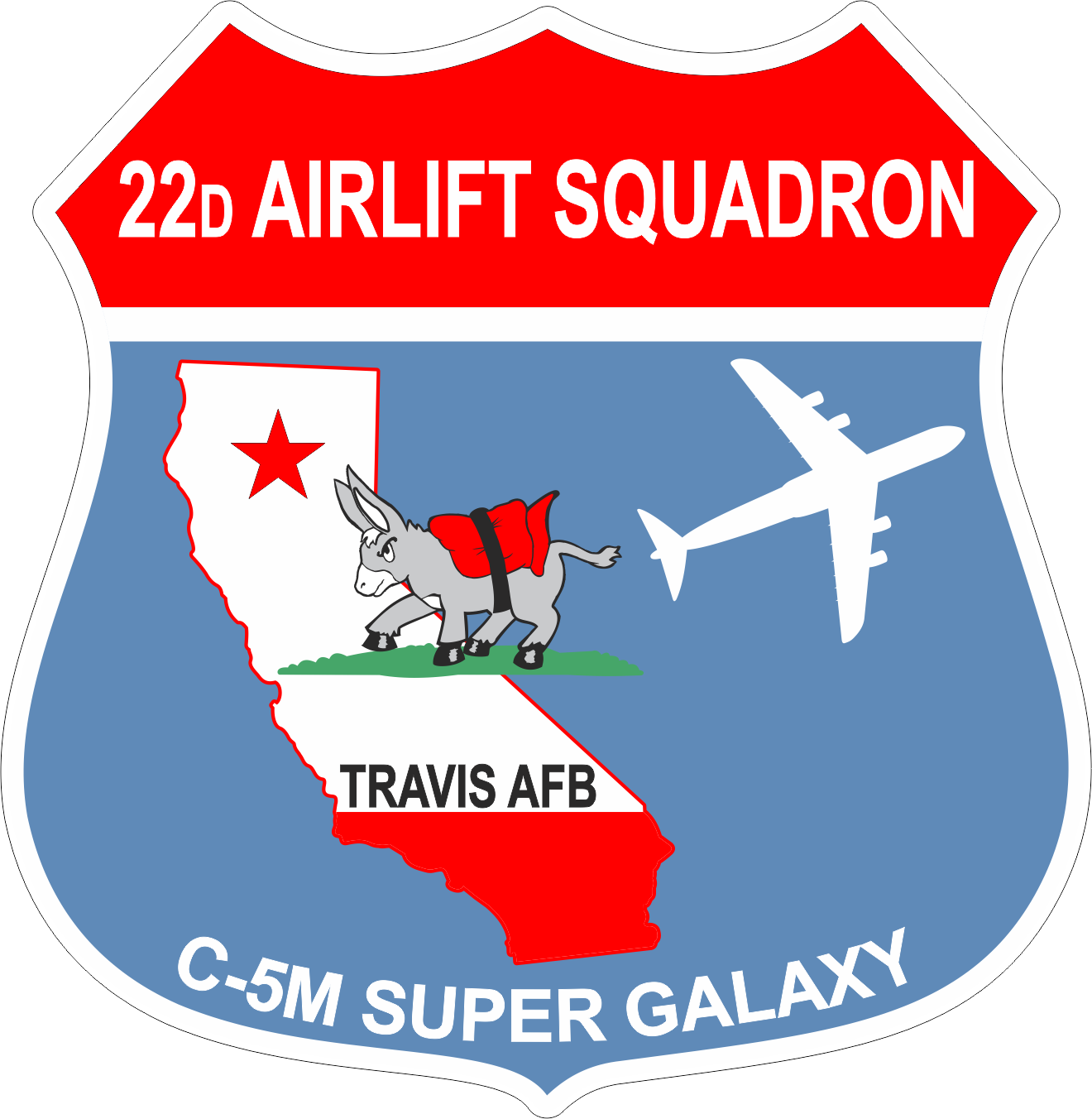 Travis AFB 22 AS C-5M Super Galaxy - 22D Airlift Squadron, Donkey & C-5M Aircraft, California State Outline, 4.5" Embroidered Patch