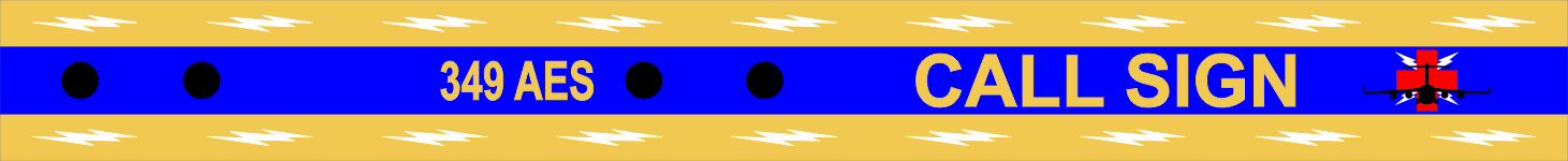 Travis AFB 349 AES Bag Tag With A Yellow & Blue Background, White Lightning Bolts, "349 AES" Text In-Between Snaps & 349 AES Logo With A C-17 On The Far Right. Our standard size measures 13.5" x 1.5" when snapped.