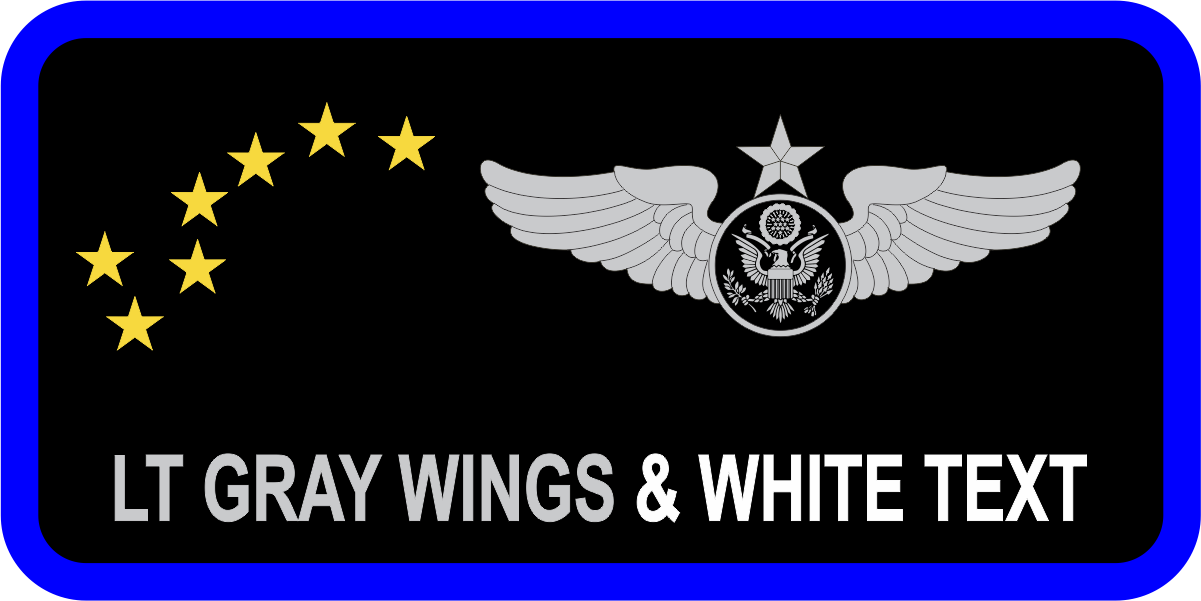 Travis AFB 349 OSS Name Tag - Black Background, Blue Border, Yellow Dipper Stars, Gray Wings & White Text.   OPTIONAL Leather Backing! Select Leather Under "Backing" If Needed!
