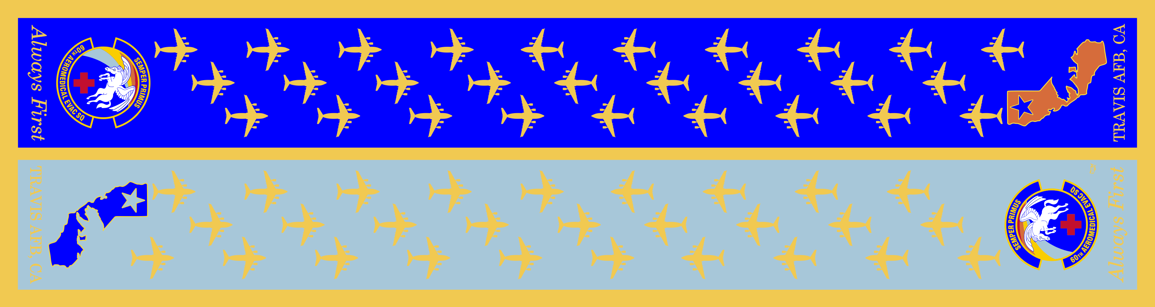 Travis AFB 60 AES Flight Scarf. Front Side: AF Blue with Yellow Border, C-17 Aircraft Pattern, 60 AES Patch on One End & California State Silhouette on the Opposite End. Back Side: Lt. Blue with Yellow Border, C-17 Aircraft Pattern, 60 AES Patch on One End & California State Silhouette on the Opposite End. Size: 6" x 48".