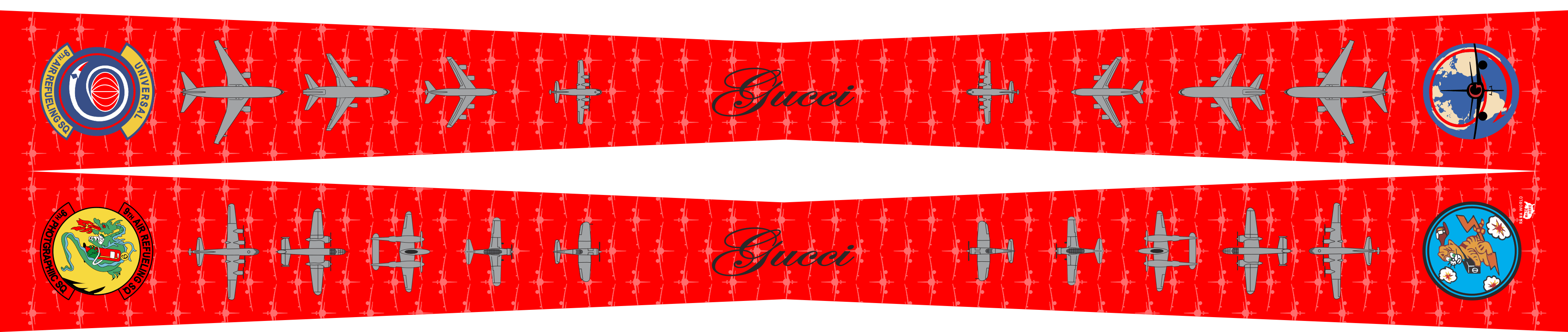 Travis AFB 9 ARS KC-46 Flight Scarf. Red Background With "Gucci" Text In The Center, "KC-46" Aircraft Pattern In The Background, Multiple Aircraft Running Alongside The Scarf & Patches On The Ends. Size: 4" x 2" x 48".