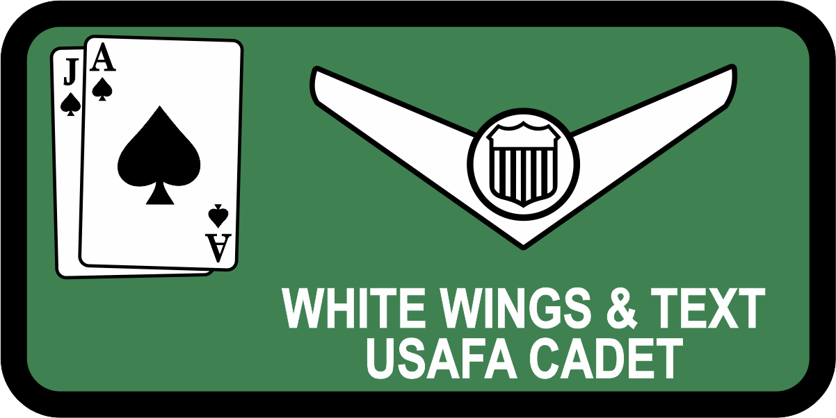USAF Academy Cadet Squadron 21 Blackjacks Name Tag: Green BackgroundBlack Border, White Wings & Text - Two Lines Of Text -- Bottom Line = USAFA CADET
