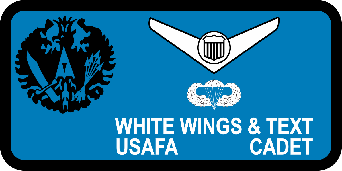 USAF Academy CS-15 Prussian Eagle Name Tag - Blue Background, Black Border, Prussian Eagle, Five-Pointed Crown, Arrows, Sword, White Wings & Text