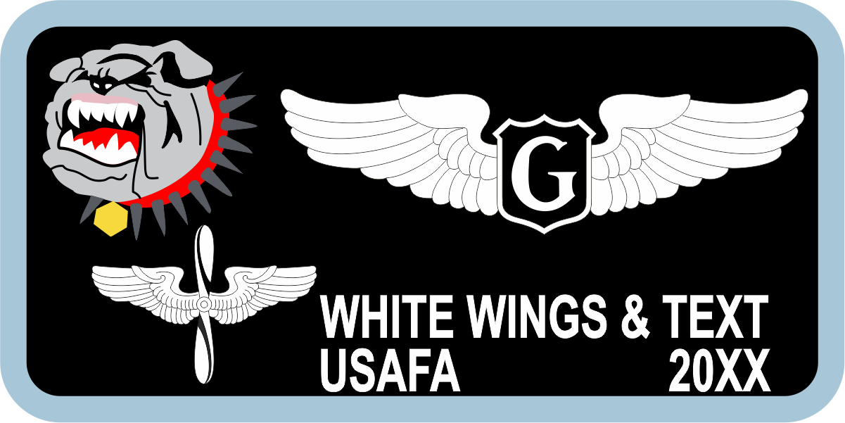 USAF Academy CS-13 Bull Dog Name Tag - Black Background, Lt Blue Border, Gray, Black Bull Dog with Red Collar, Gray Spikes, White Wings & Text