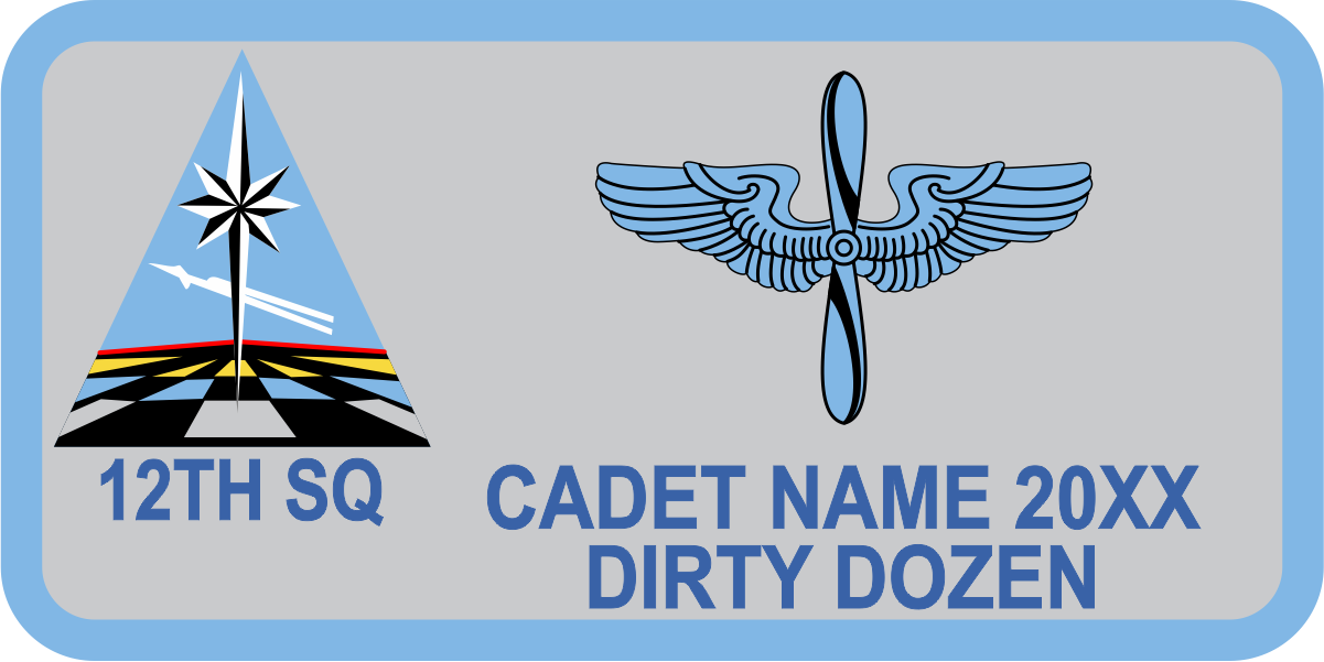 USAF Academy CS-12  Name Tag - Isosceles Triangle, White Polaris Star. Jet Plane, Airfield, Checkered Design with Black & Silver Squares, Gold/Black Squares, Blue Sky, Gray Background, Lt Blue Border, & Wings, Royal Blue Text.