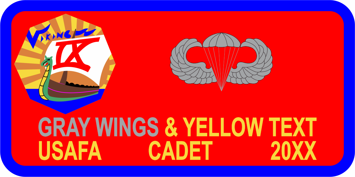 USAF Academy CS-09 Viking Name Tag - Red Background, Blue Border, Multi-Colored Octagon-Shaped Viking, Dragon Ship Logo, Gray Wings & Yellow Text