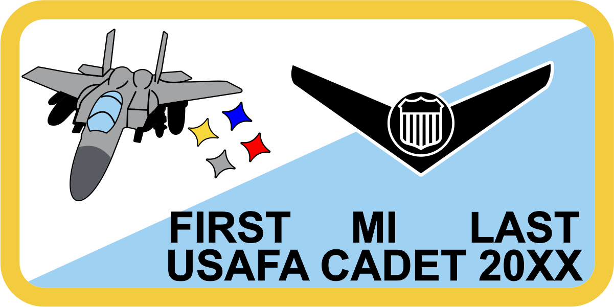 USAF Academy CS-08 - Yellow Border Name Tag - Half White and Half Light Blue, Yellow Border, Black Wings & Text, Gray F-15E, Four Stars