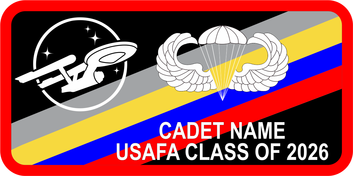 USAF Academy CS-19 Space Name Tag - Black Background with Gray, Yellow, Blue & Red Stripes, Red Border, White Wings & Text
