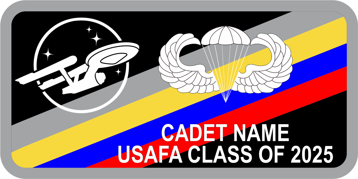 USAF Academy CS-19 Space Name Tag - Black Background with Gray, Yellow, Blue & Red Stripes, Gray Border, White Wings & Text