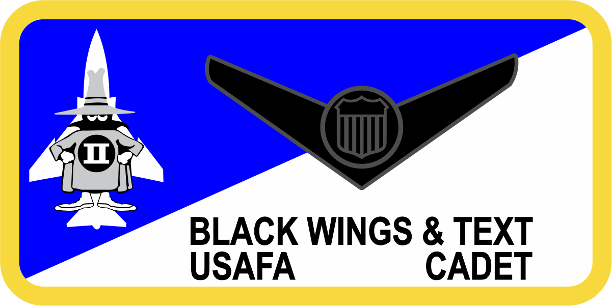 USAF Academy CS-24 Spooky Name Tag - Half Blue and Half White, Yellow Border, Black Wings & Text, Spooky Logo with Aircraft