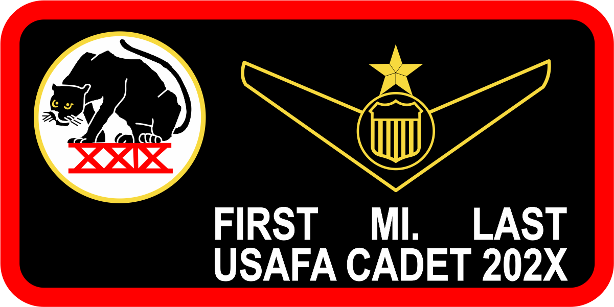 USAF Academy CS-29 - Name Tag -- Black Background, Red Border, Yellow Wings & White Text, Black Panther Logo