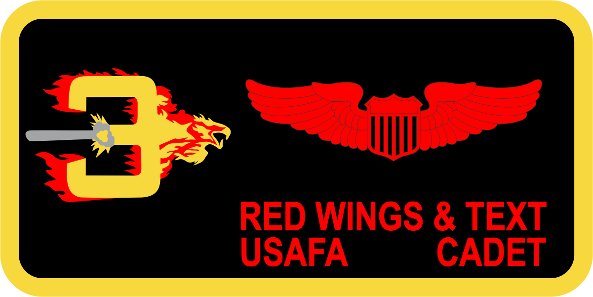 USAF Academy CS-24 Fire Flame Eagle Group 3, Name Tag - Black Background, Yellow Border, Yellow 3 with Red/Yellow Flames, Flamming Eagle, Red Wings & Text