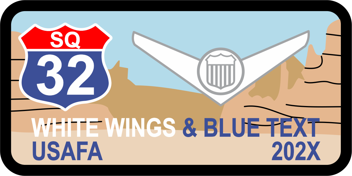 USAF Academy CS-32 Mountains Name Tag - Blue Sky Background, Black Border, Tan Mountains, SQ 32 Shield Logo, White Wings & Blue Text