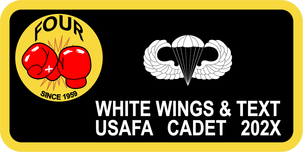 USAF Academy CS-04  Red Boxing Gloves Name Tag - Black Background, Yellow Border, White Wings & Text, Four with Red Boxing Gloves Since 1959 Logo