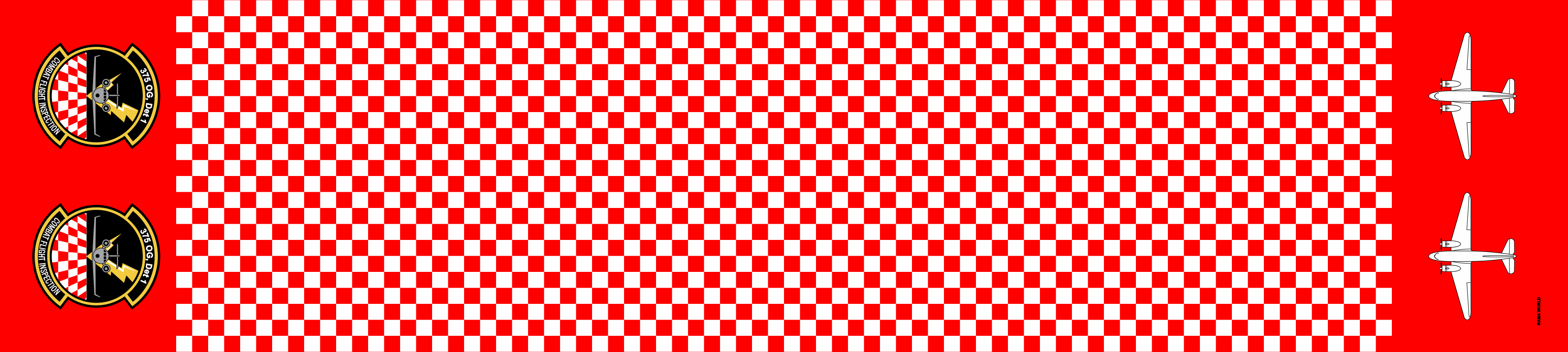 Will Rogers ANGB 375 OG Det 1- Red and White Checkerboard Scarf with Patches and DC-3 Aircrafts on the ends of the Scarf. Size: 6" x 48" Fabric Type :FS Satin
