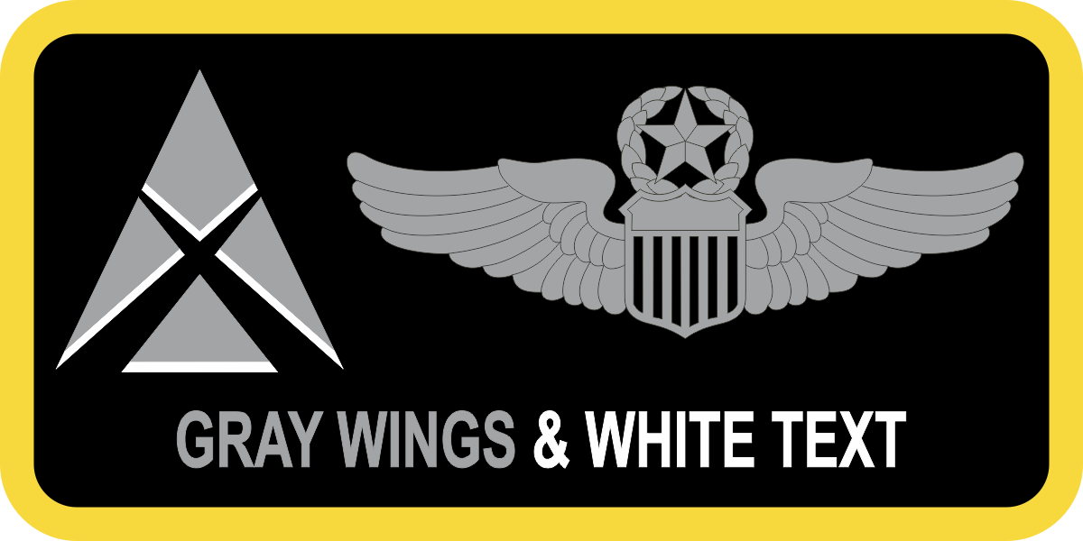Wright-Patterson AFB AFWERX Name Tag- Black Background, Yellow Border, Gray Wings & White Text with AFWERX Logo Gray/White