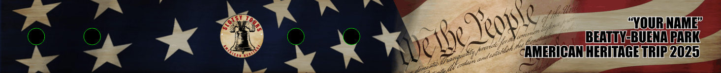 American Heritage Tour Bag Tag. American Flag & U.S Constitution In The Background & "Slotsy Tours" Emblem In-Between Snaps. Our Standard Size Measures 13.55" x 1.5" When Snapped.